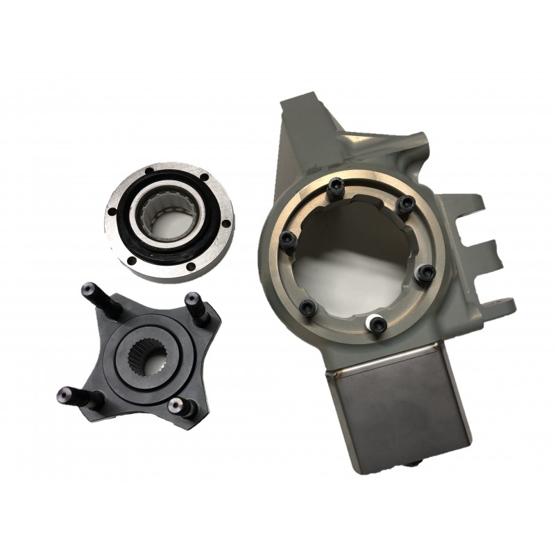 Pivot alu, roulement, visserie et écrou, support axe, axe pivot, rondelle axe, tôle pare-chaleur, moyeu et goujons